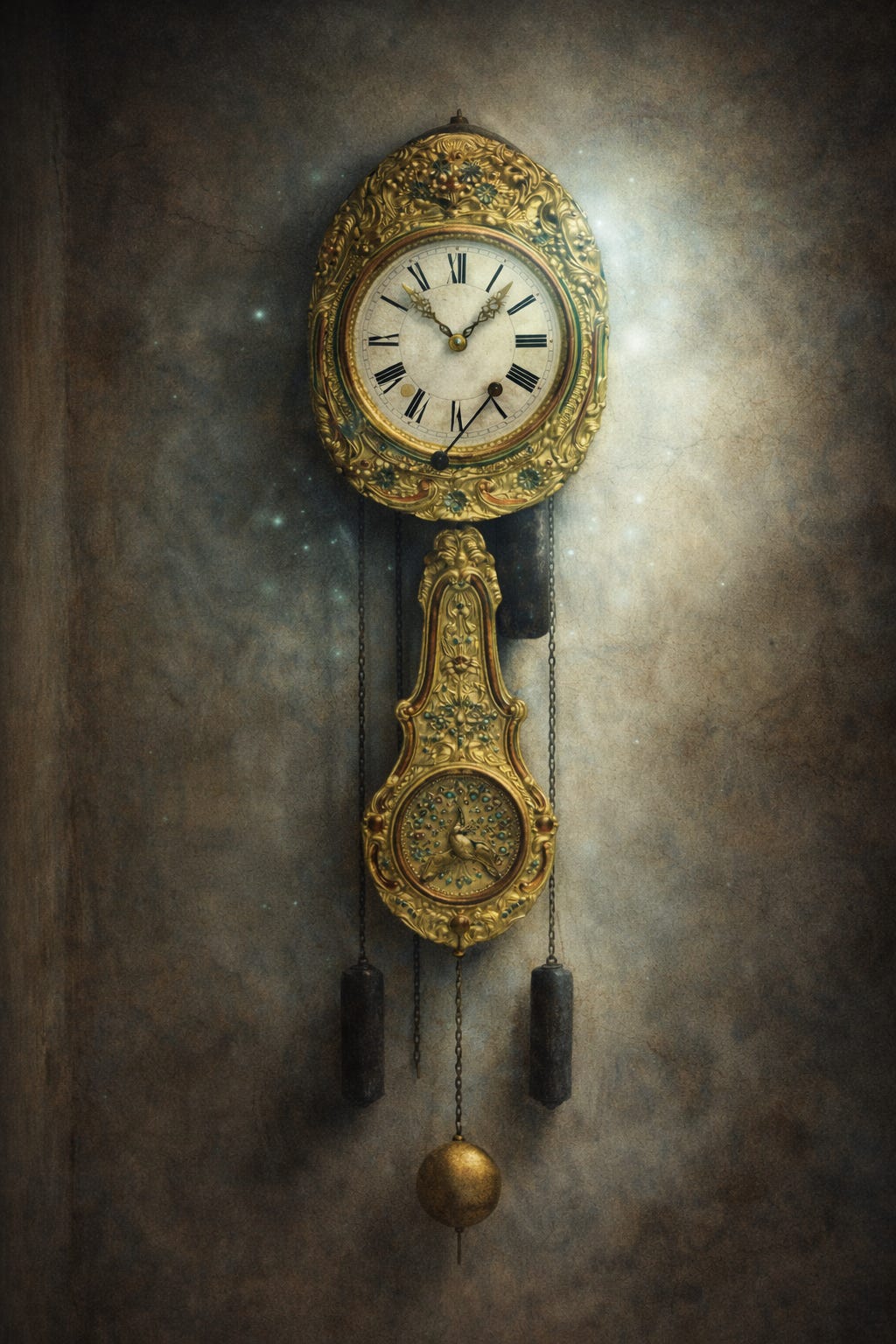 It hung on the wall opposite me. Tall. Mounted on dark wood. To me it looked like a grandfather clock that had lost its case—the pendulum fully exposed, swinging in slow, hypnotic arcs. Its face was framed by ornate golden brass pressed into shapes I couldn’t quite make out—flowers, scrollwork, figures emerging from the metal. The pendulum itself was massive, decorated with the same elaborate work.