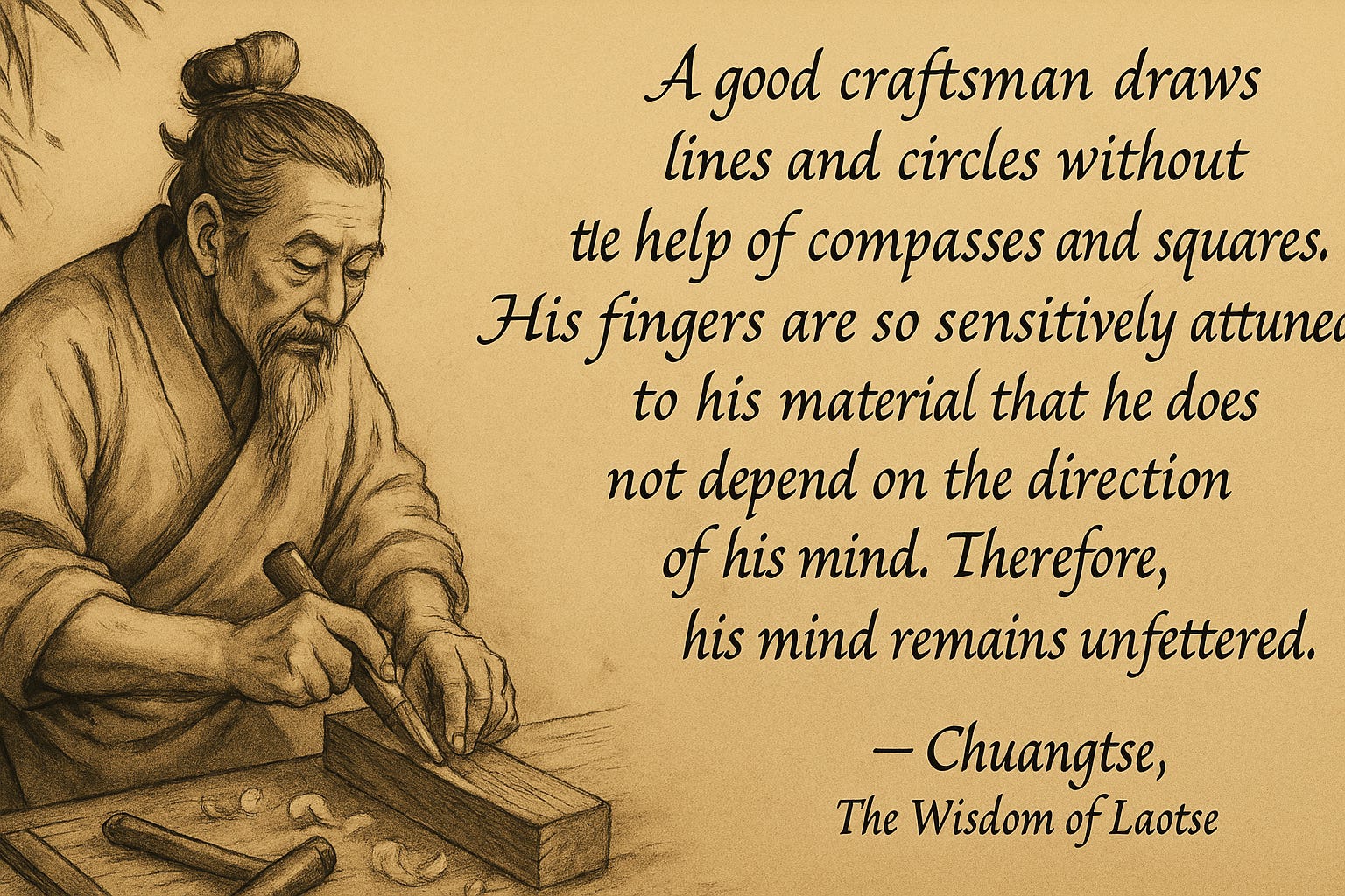 Chuangtse’s craftsman has crossed that threshold. His fingers are sensitively attuned to his material. His body remembers what his mind cannot explain. He is no longer thinking about his craft. He is simply moving with it.