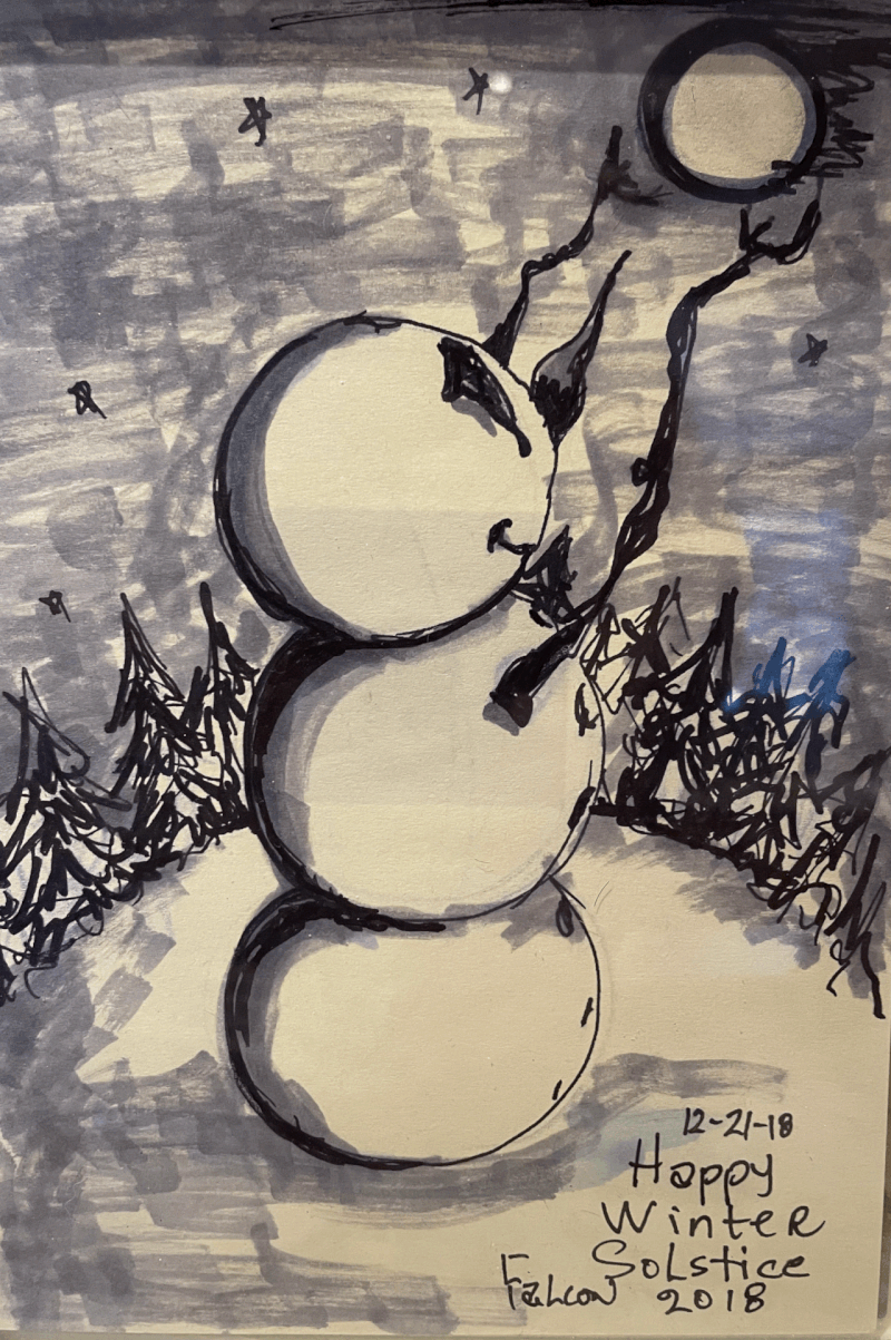 Years ago, my artist friend Lizzy Falcon made me this drawing to mark the day. A snowman under a dark sky, arms raised, reaching toward the sun. It’s dated in the corner. “Happy Winter Solstice.” I’ve kept it close ever since, not as something to analyze, but as something that holds the feeling of the day intact.